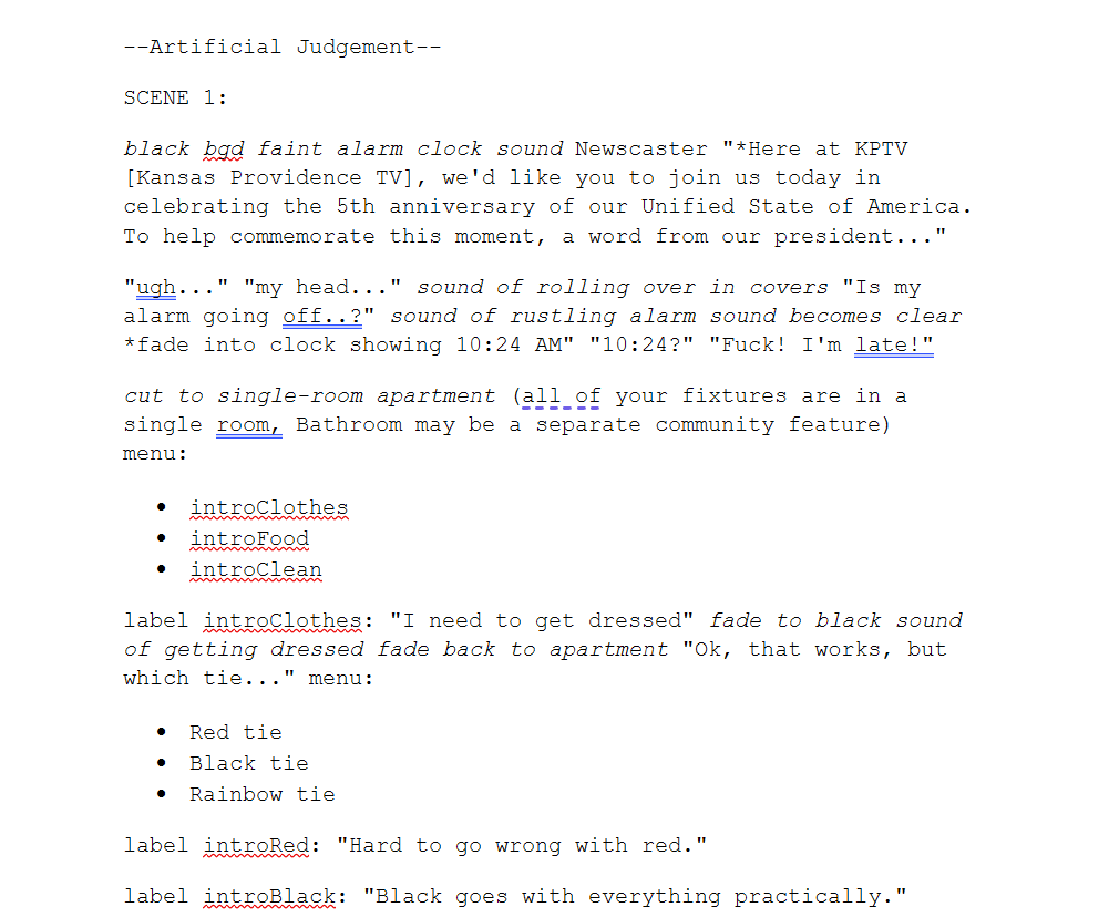 The first one of these was considering the narrative's structure and continuity. I initially just wanted my court cases to be vignettes, I was given a note that it may be interesting to have cases tie into one another. I think this is a great idea as the experience is quite long enough to warrant multiple vignettes, and tying multiple stories together emphasizing the theme of subjective analysis versus objective.